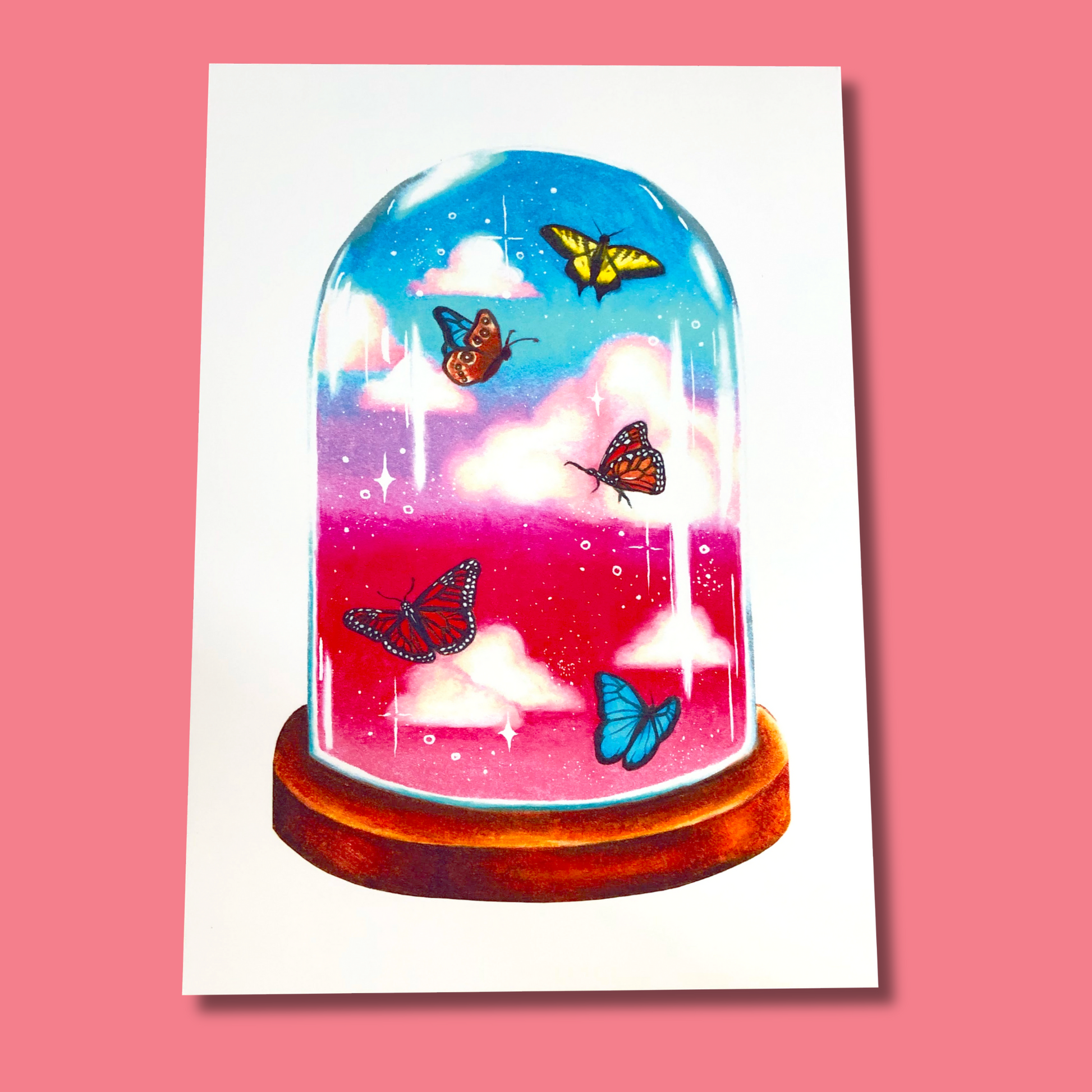 - Design features beautiful butterflies flying around a cloudy blue and pink sky.