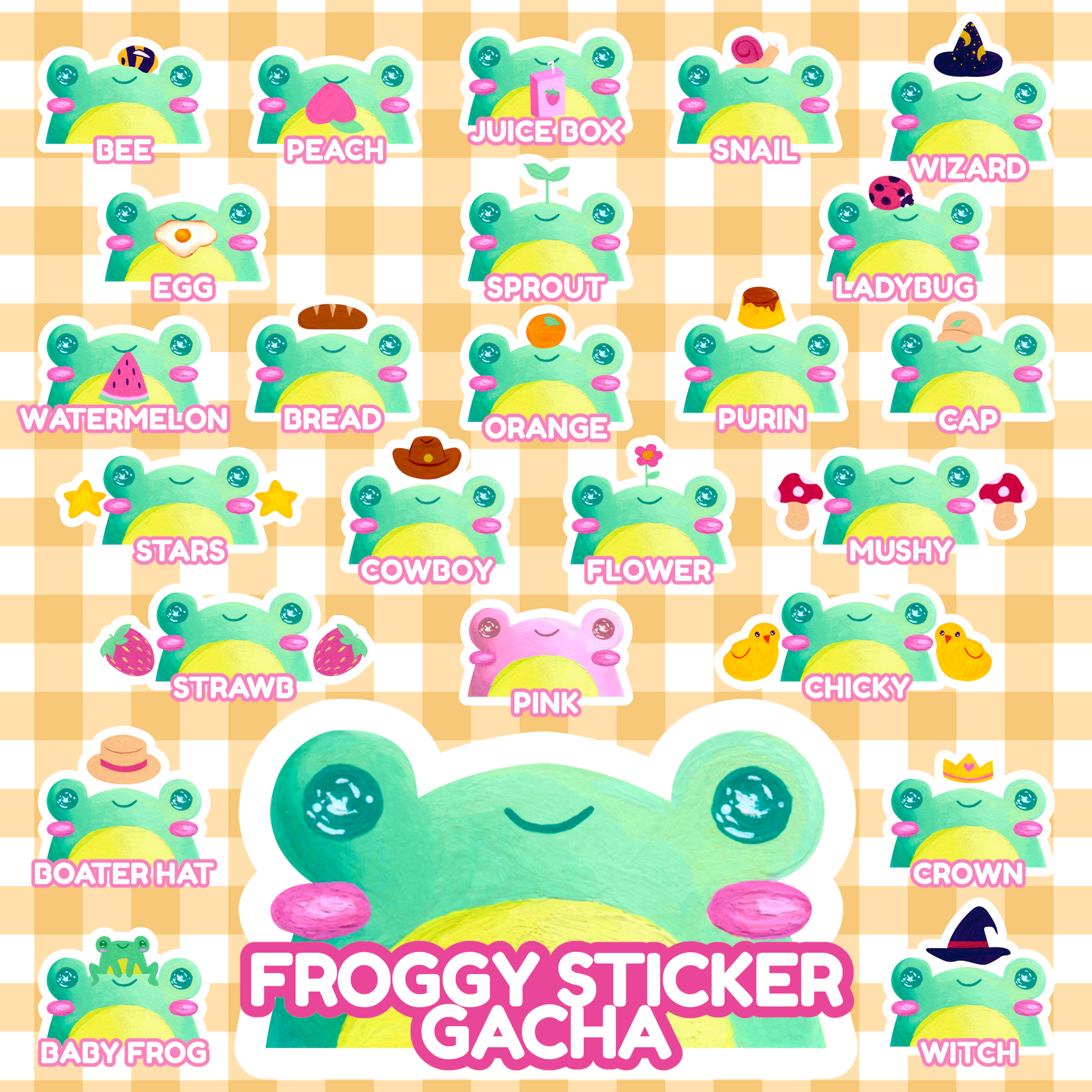 - Designs feature a froggy with a variety of different hats/items/snacks/etc. All art was made with gouache paint.