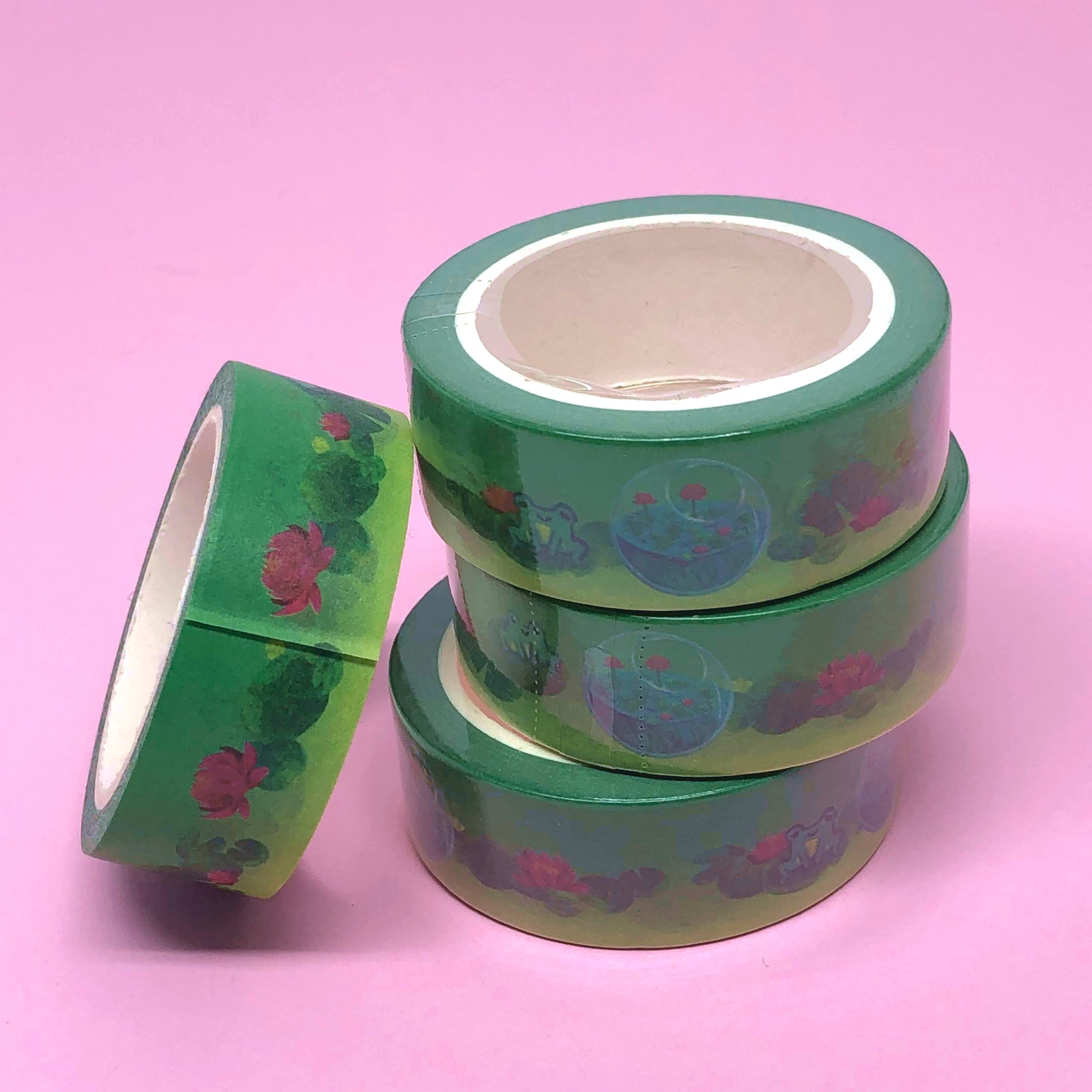 - Design features cute little frogs with lily pads and lily flowers against a green to light green gradient background.