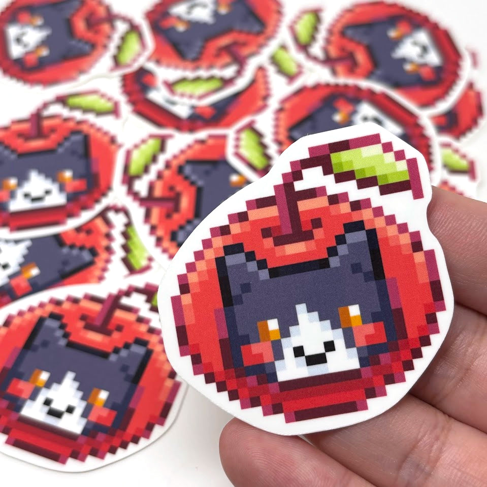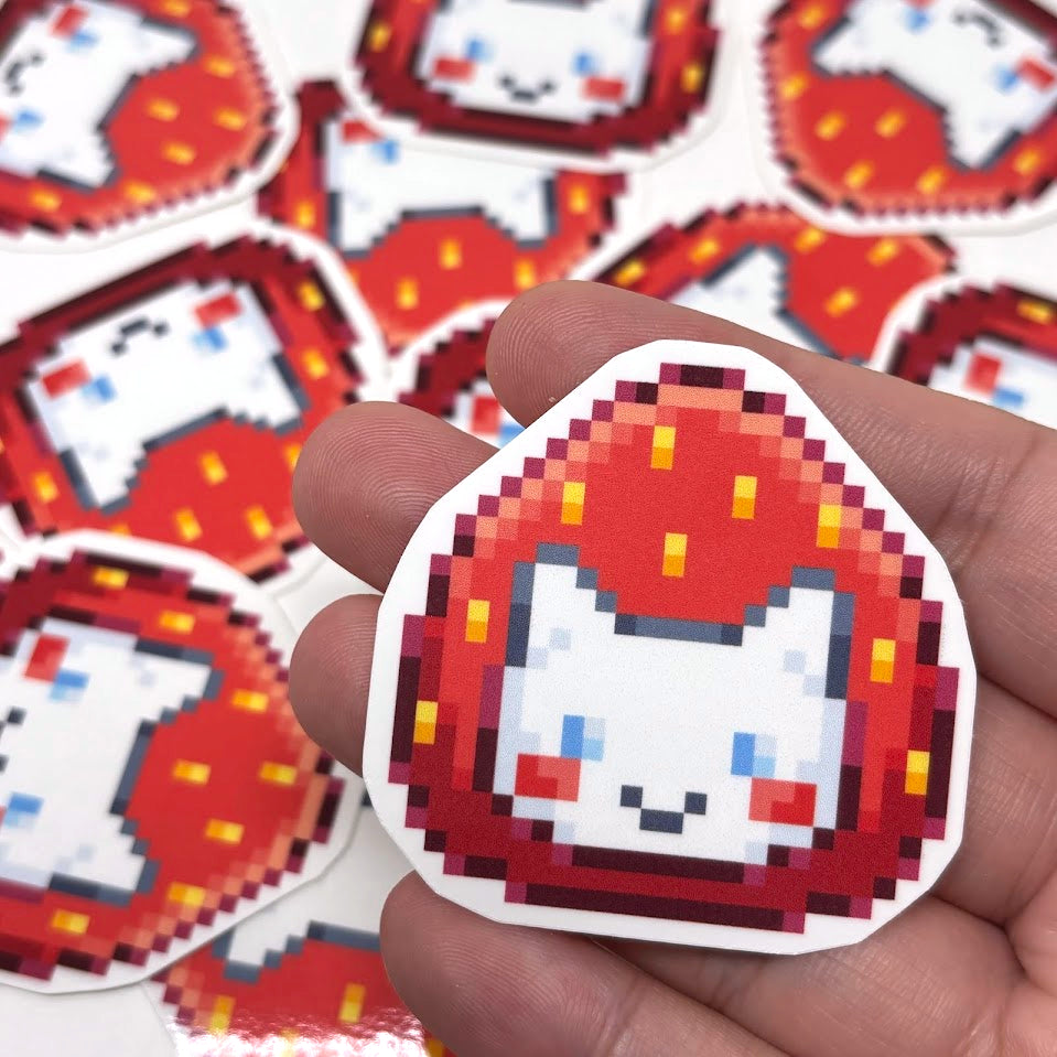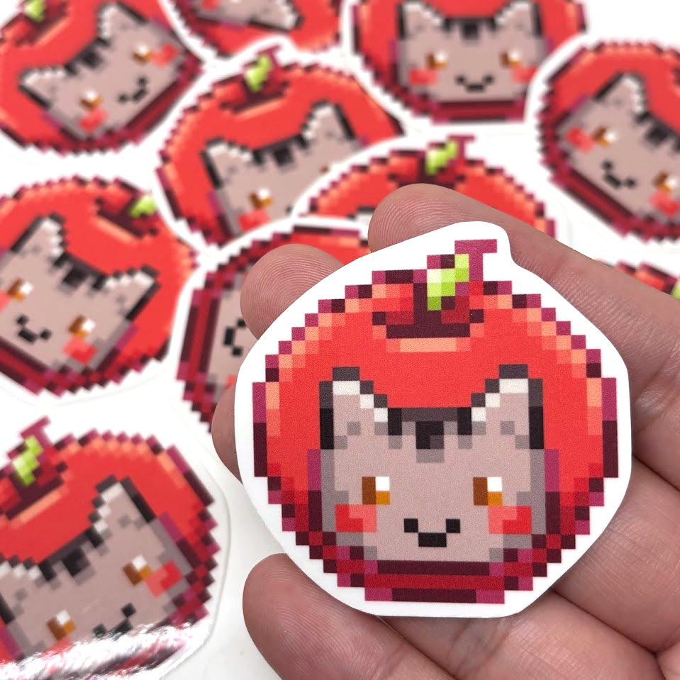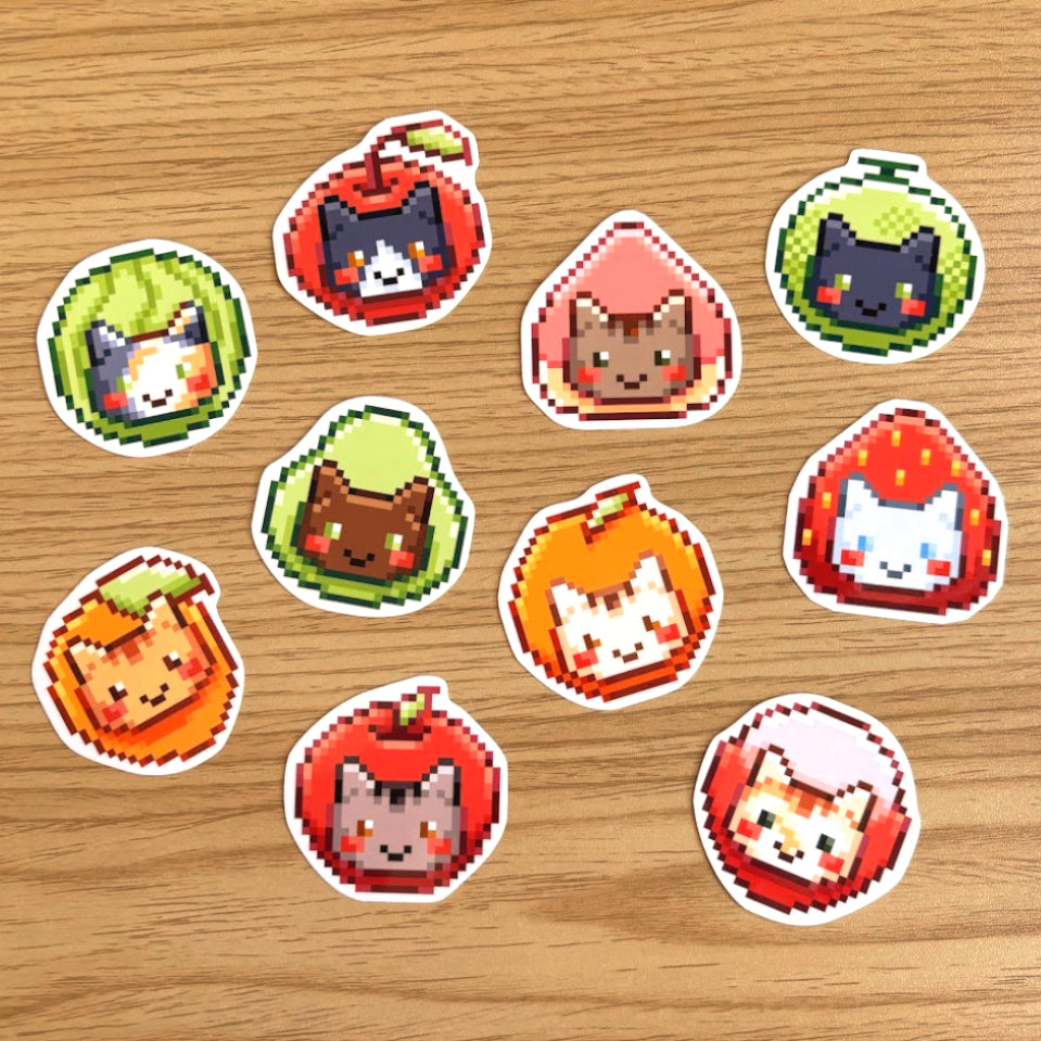 - Design features pixel art of various colored cats wearing fruit hats. :3