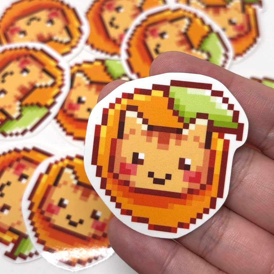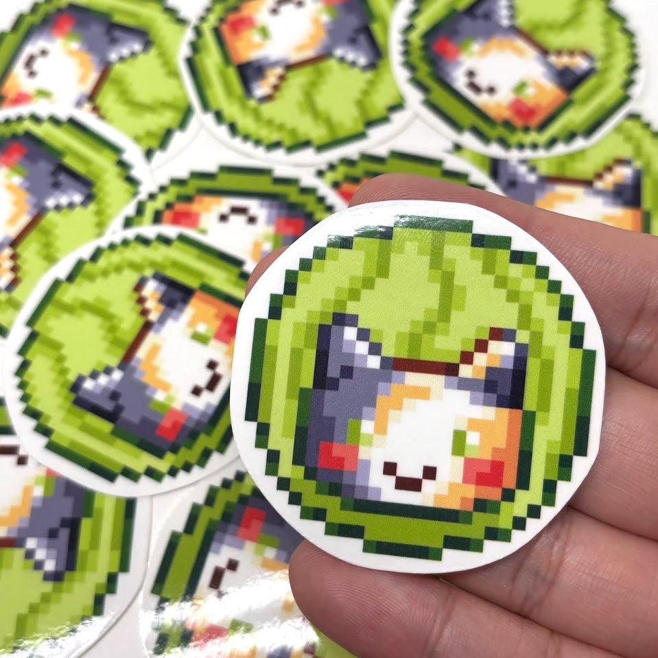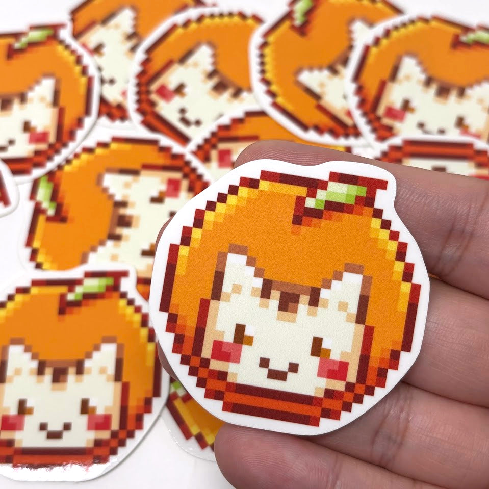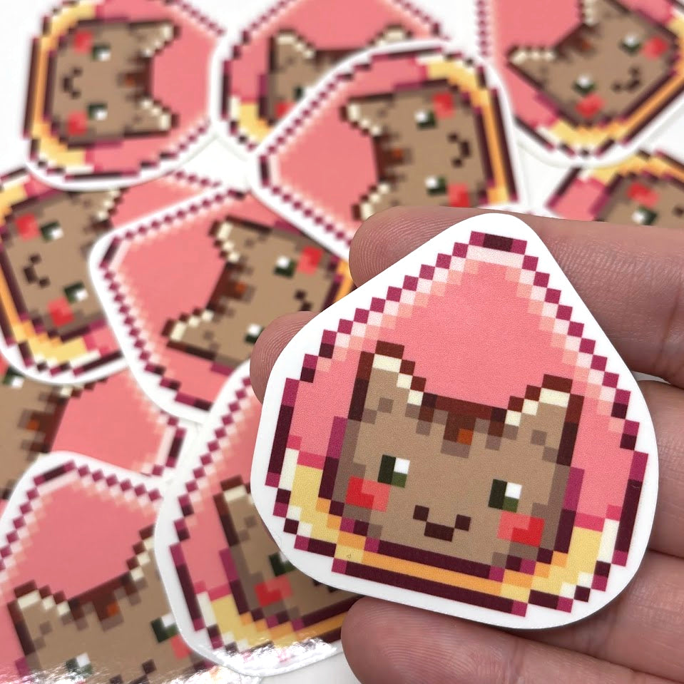 - Design features pixel art of various colored cats wearing fruit hats. :3