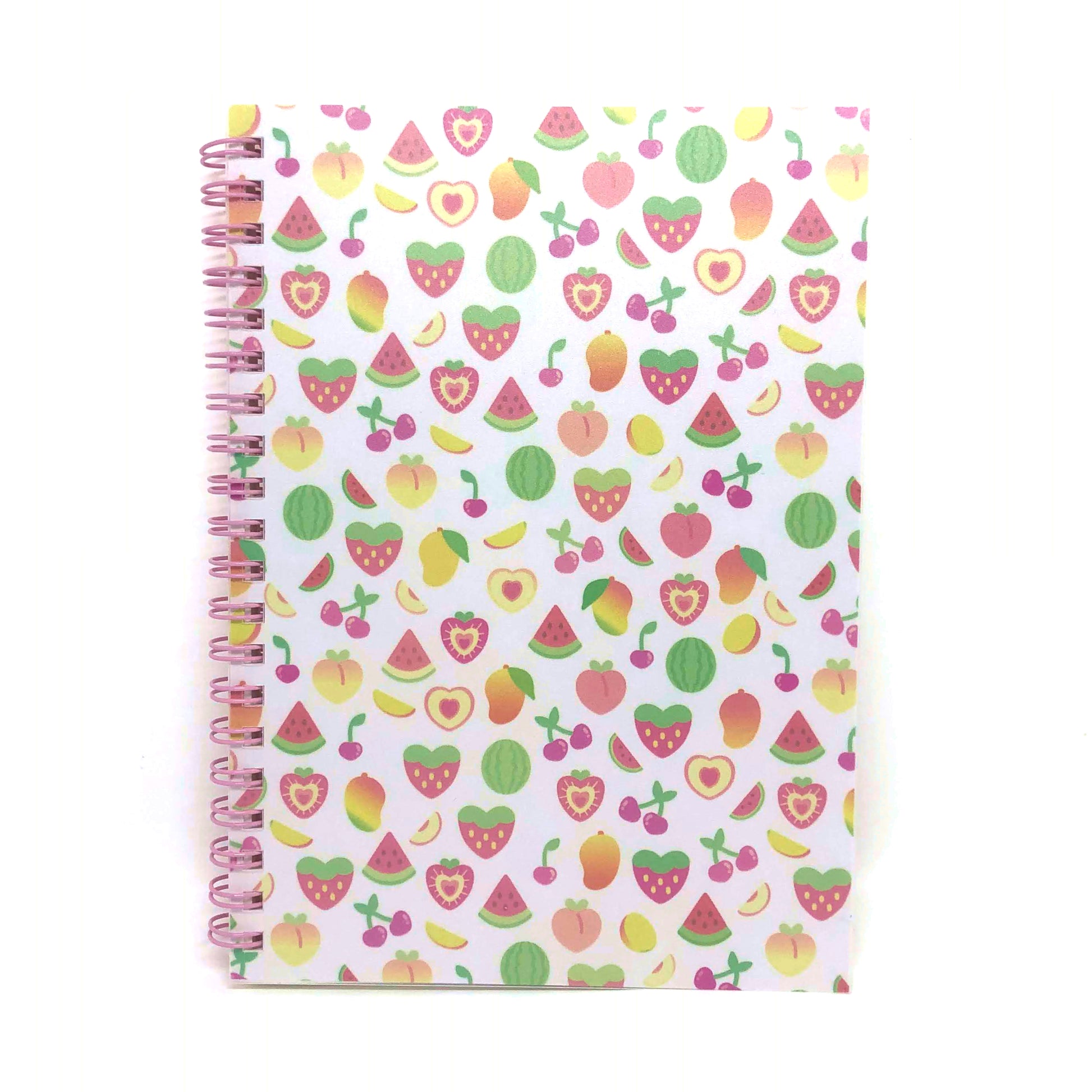 - Design features a pattern of various colorful fruit against a white background.