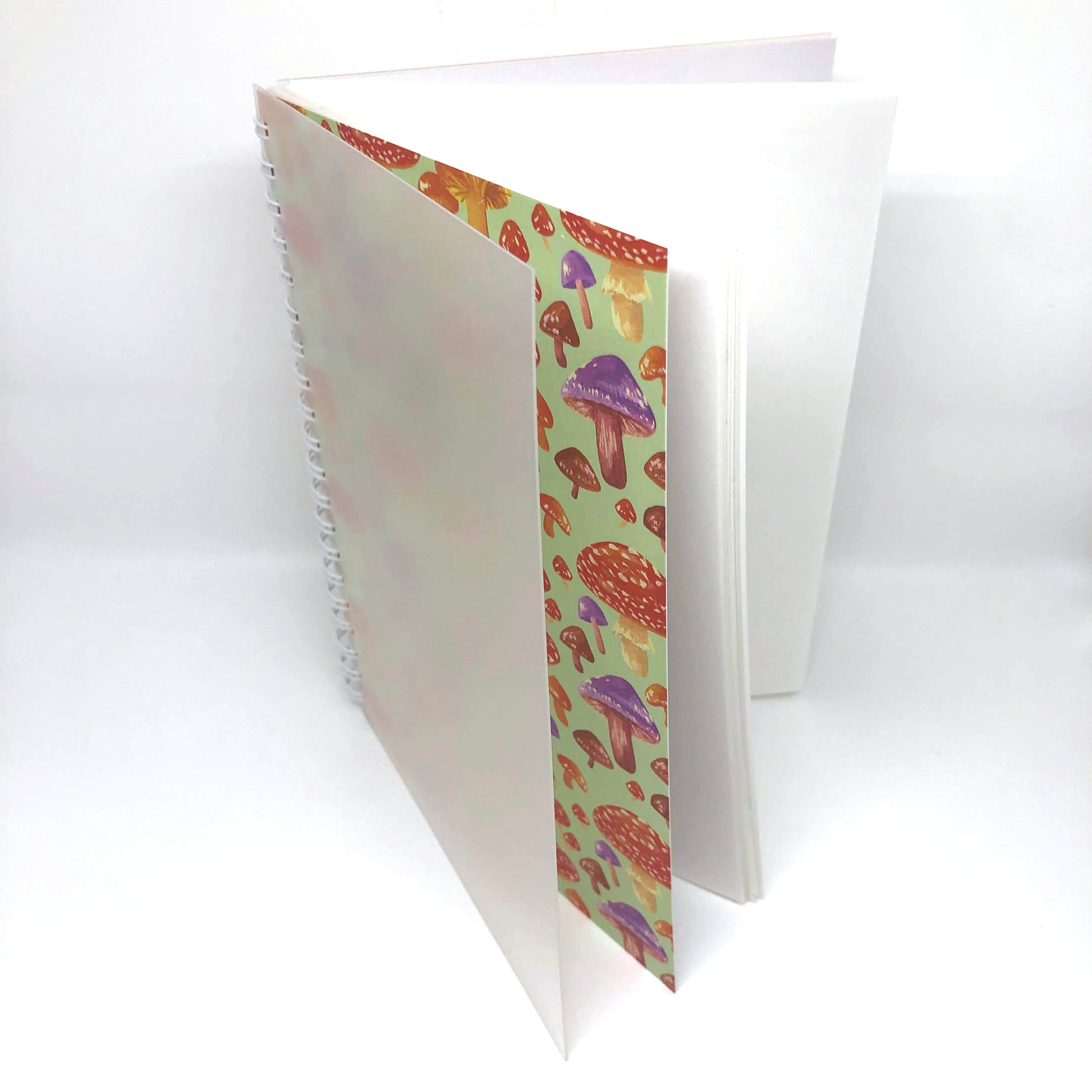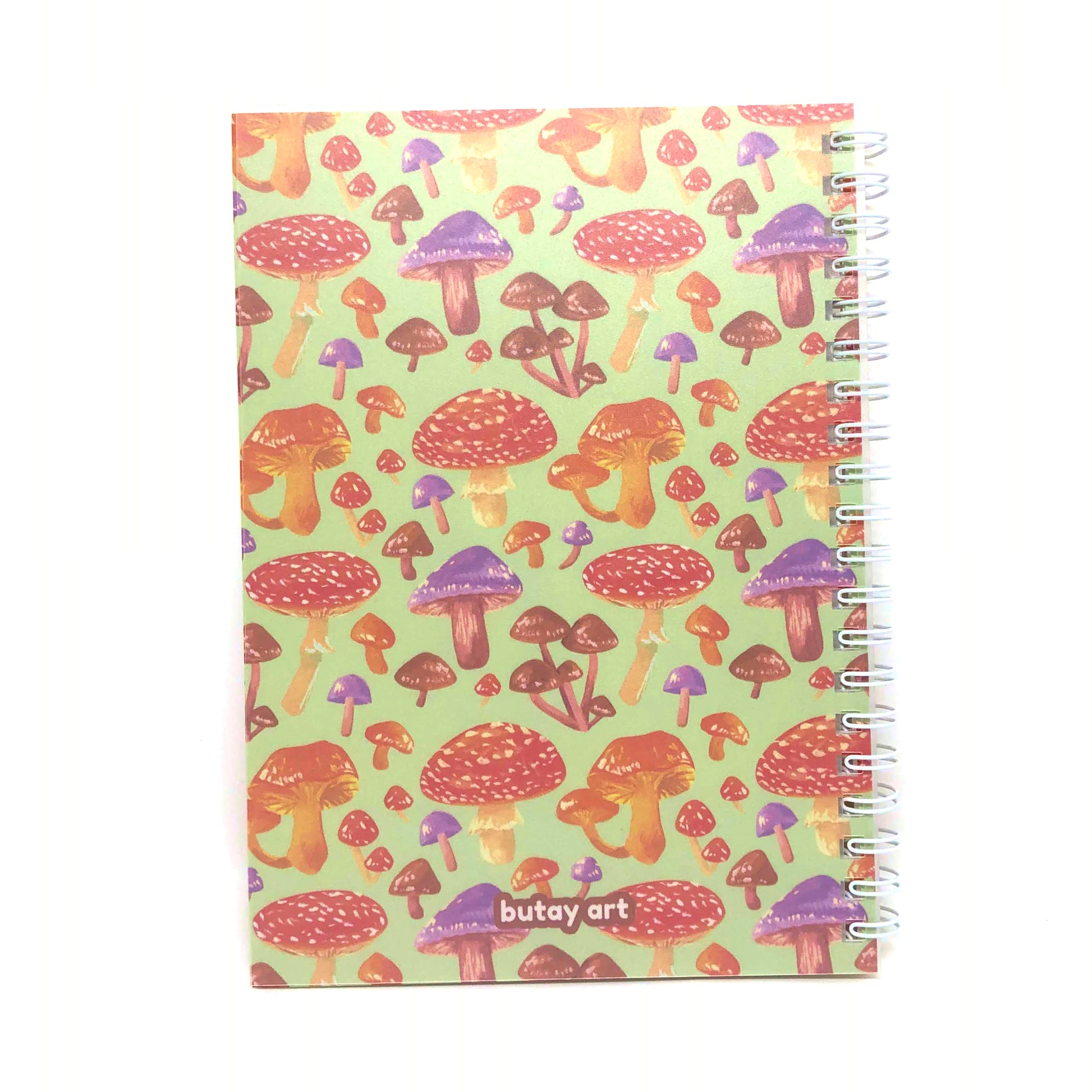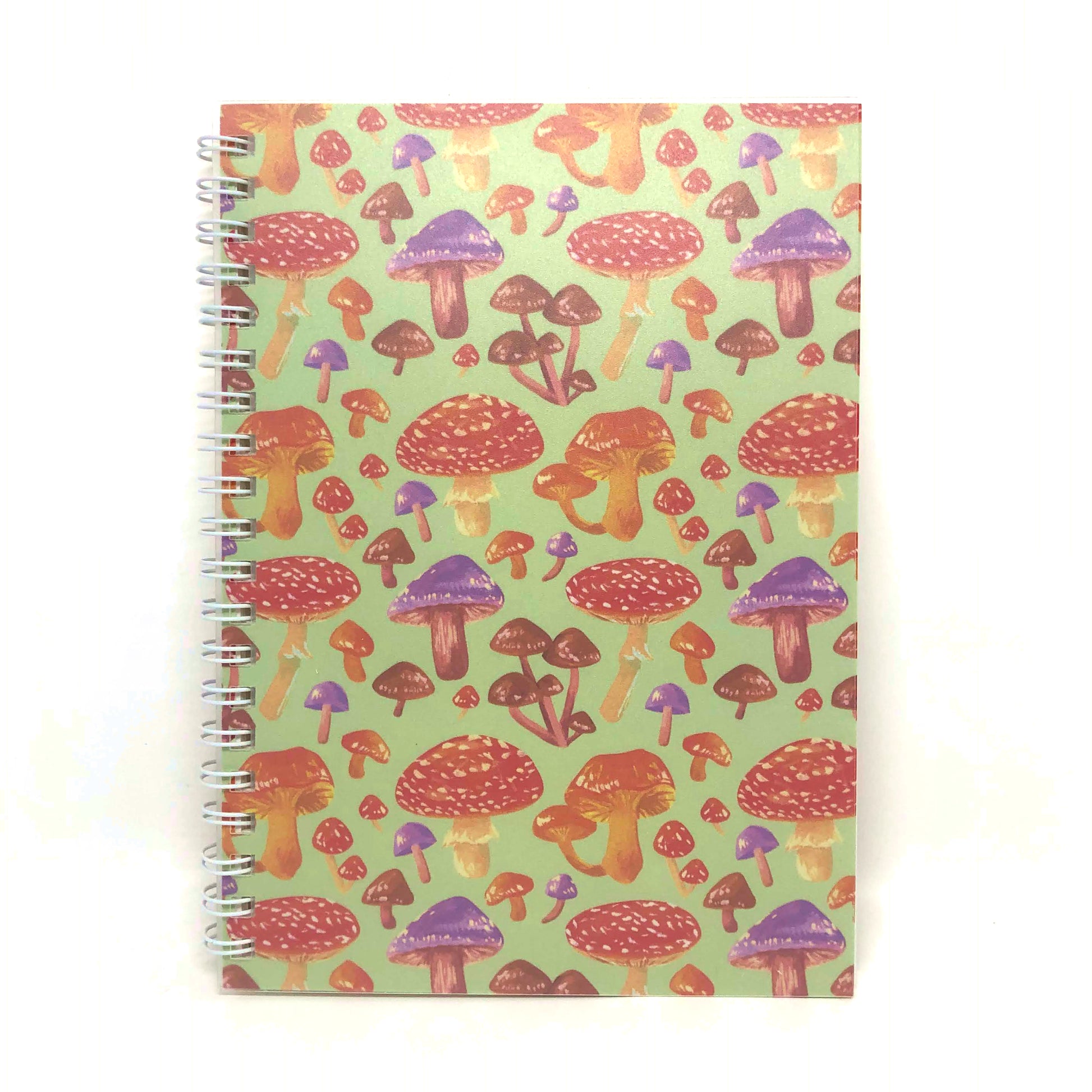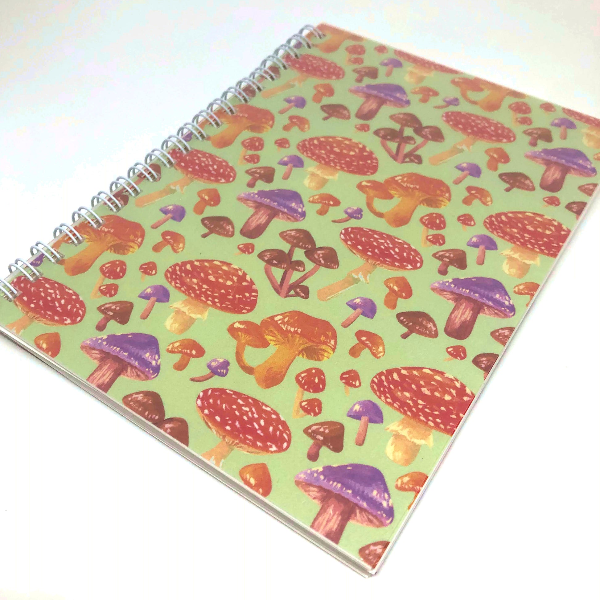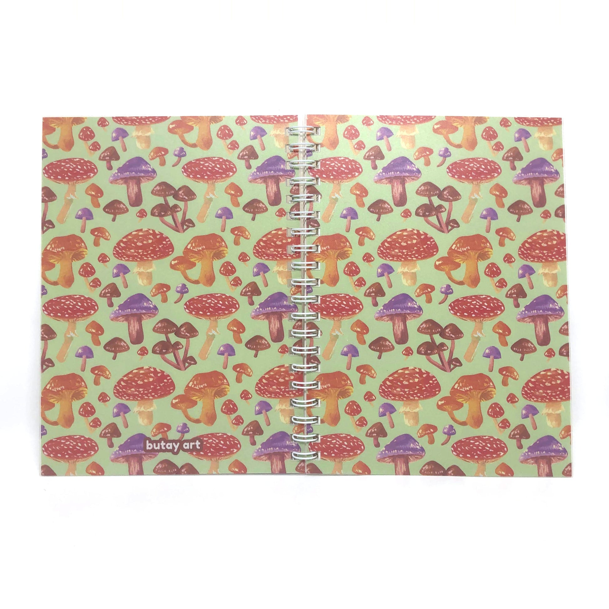 - Design features a pattern of various colorful mushrooms against a green background.