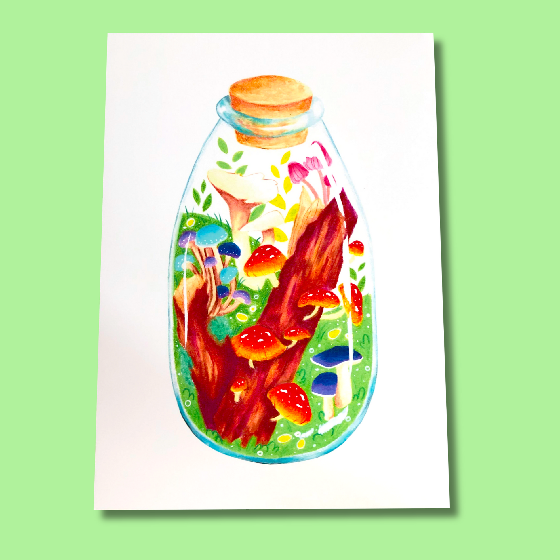 - Cottagecore mushroom design made from an original colored pencil drawing.