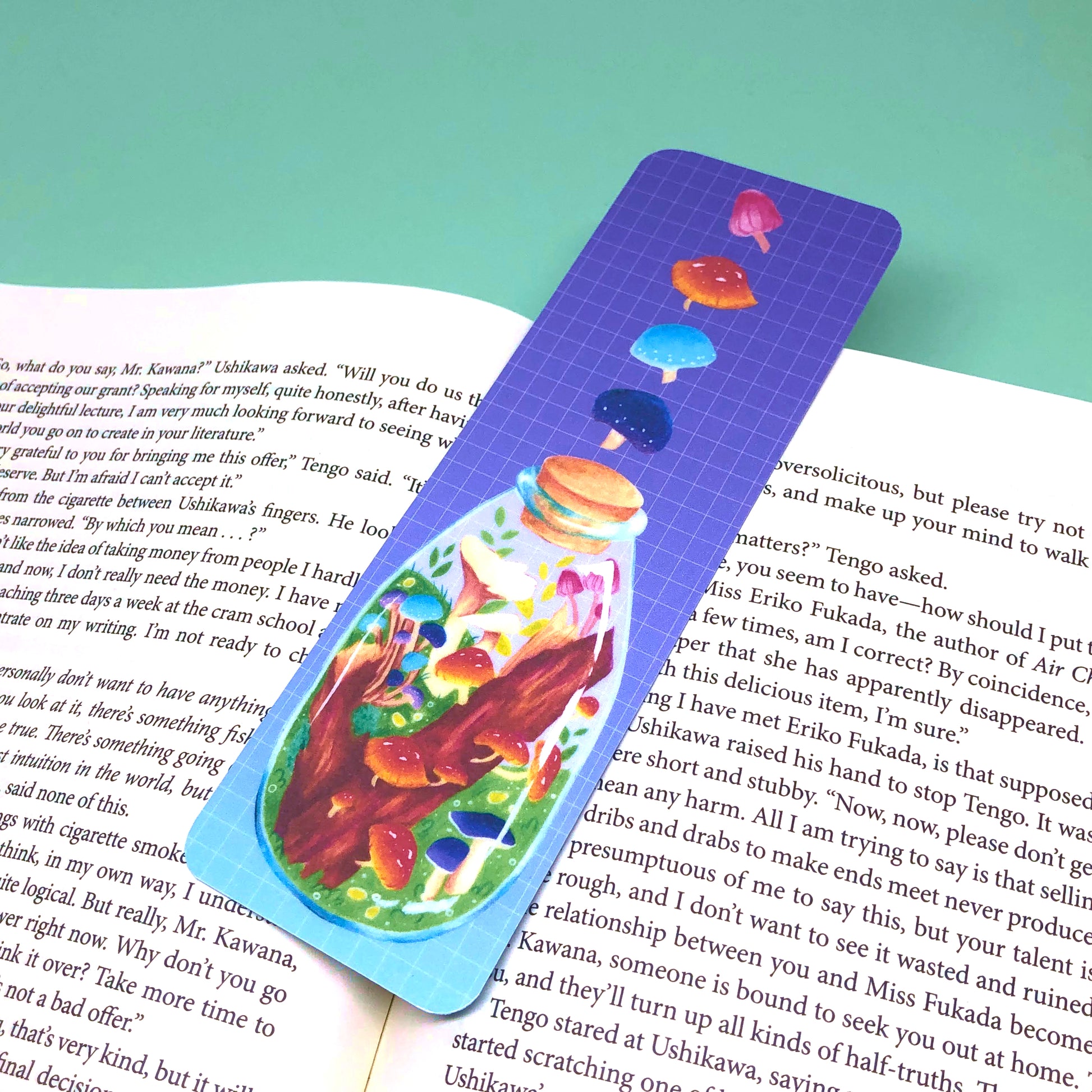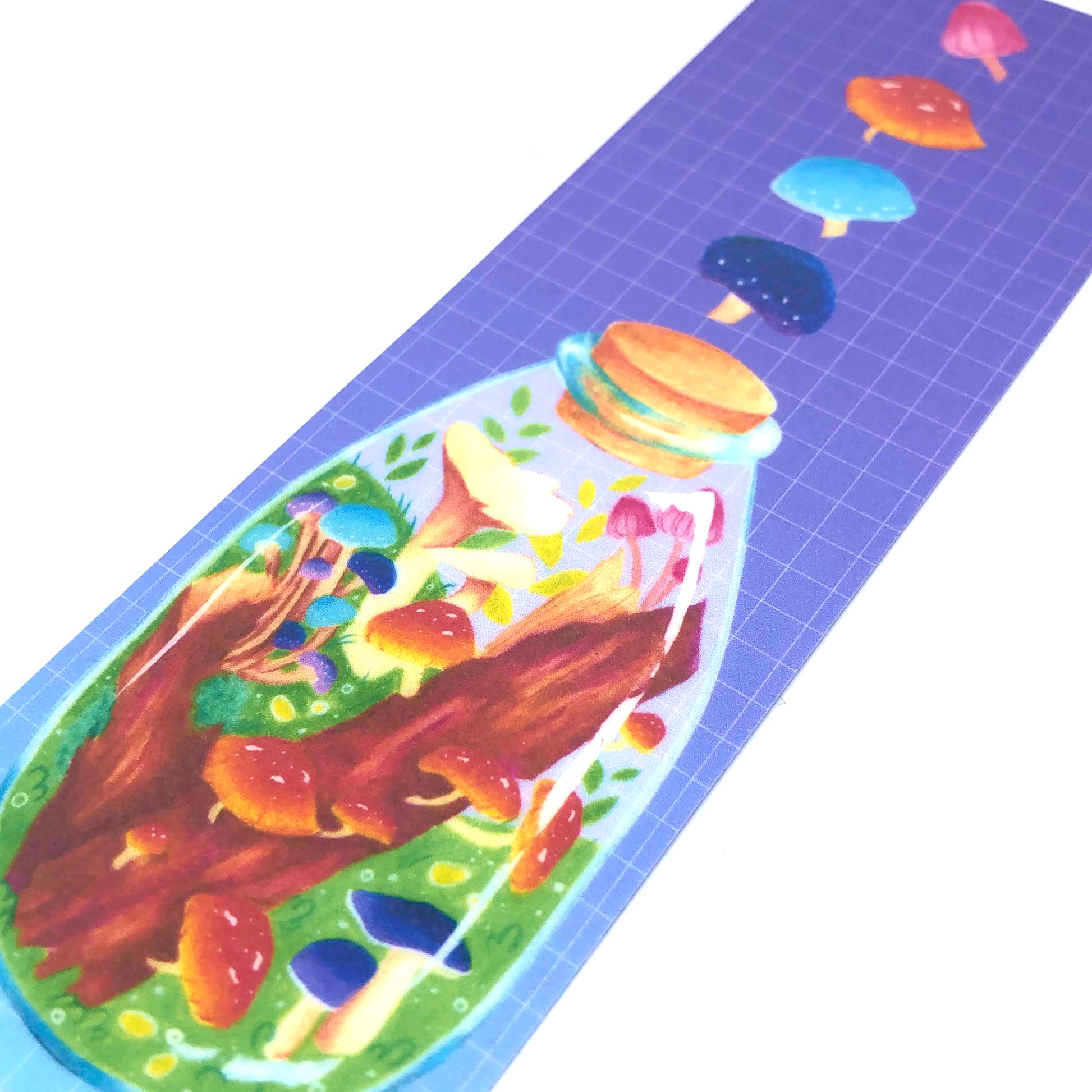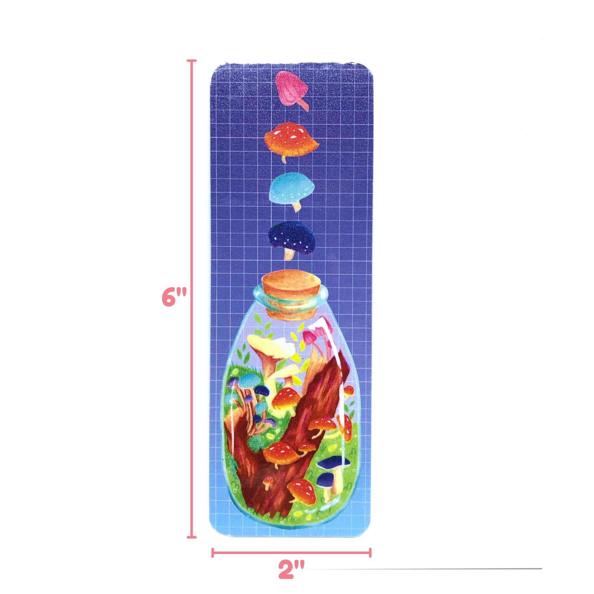 - Design features a tall mushroom terrarium filled with colorful mushrooms, moss, and a log against a purple to blue gradient background.