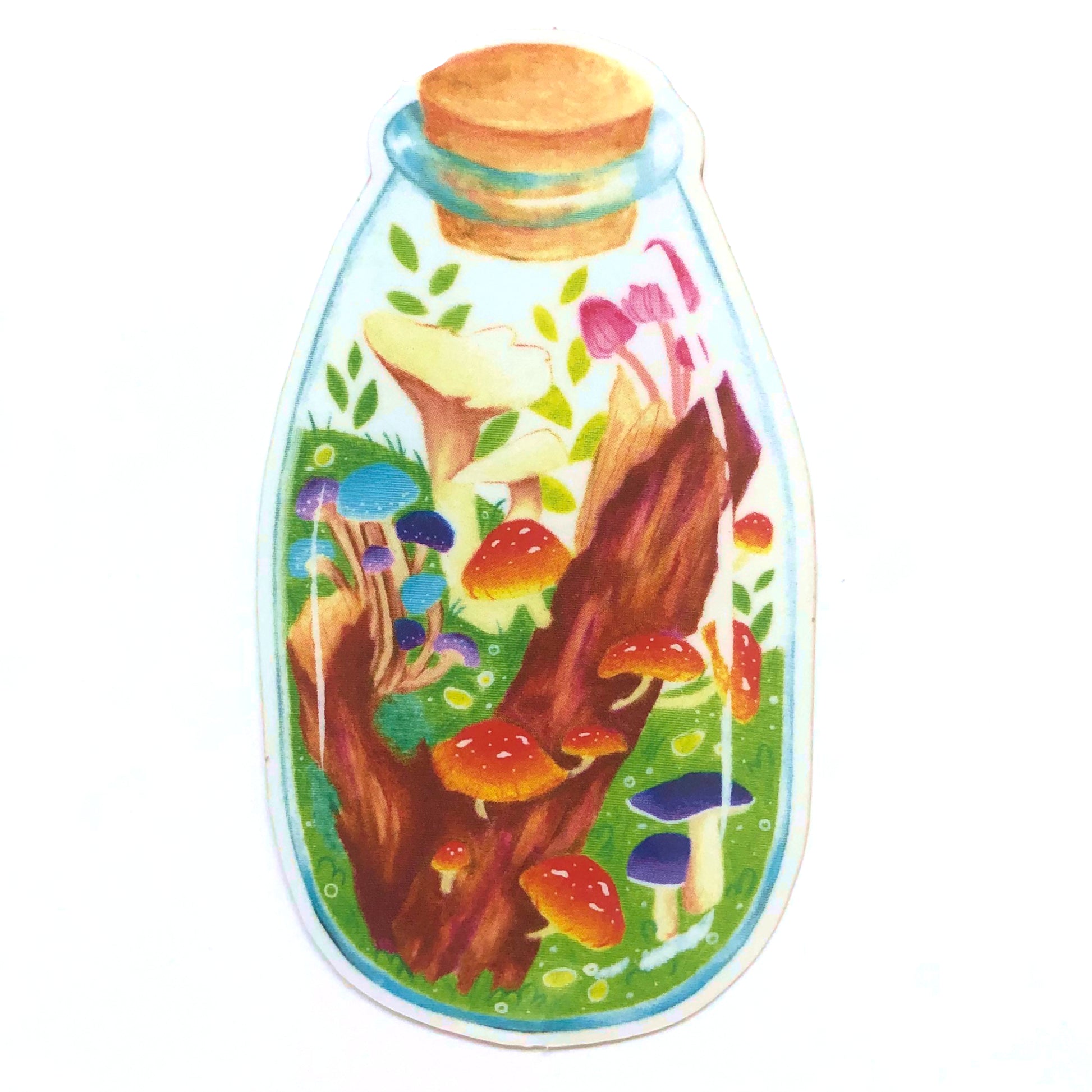 - Design features a tall mushroom terrarium filled with colorful mushrooms, moss, and a log.