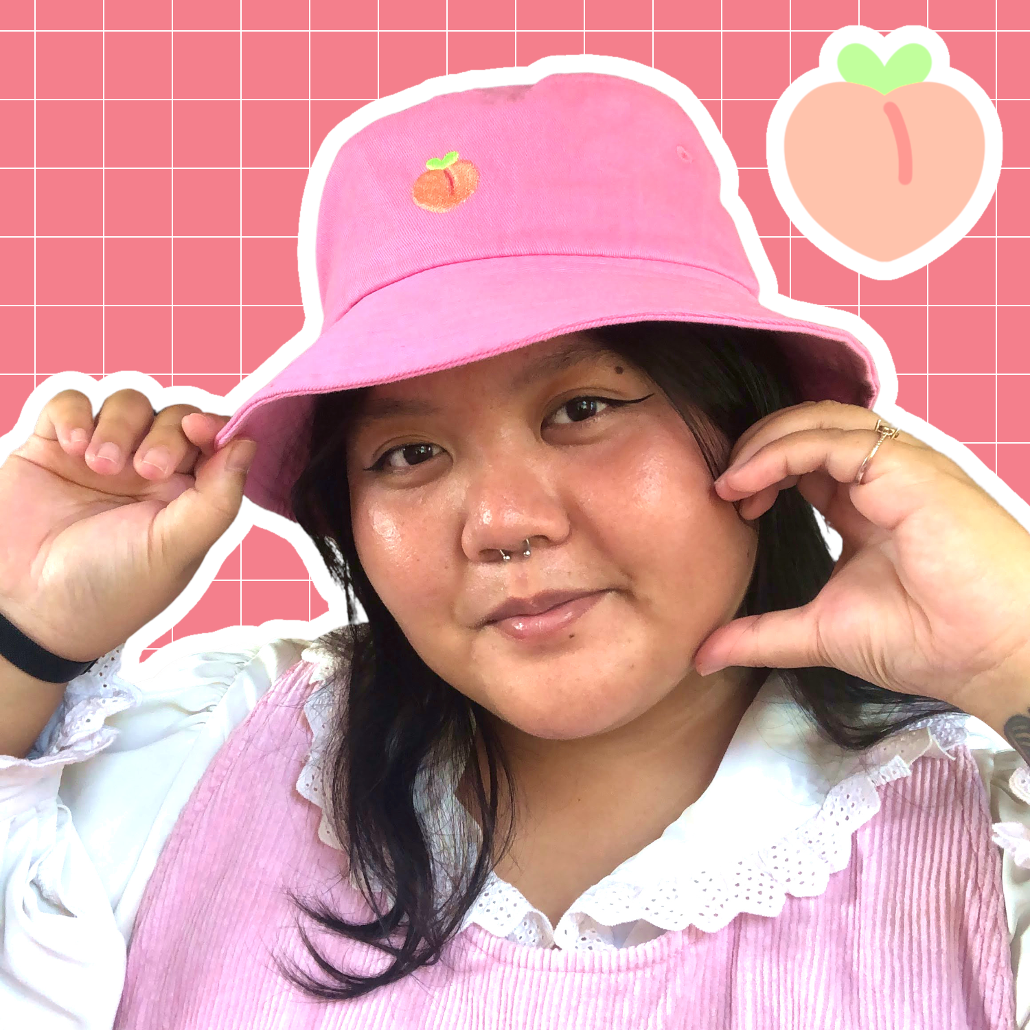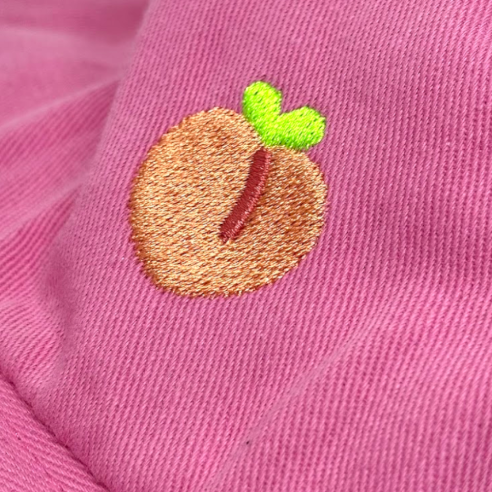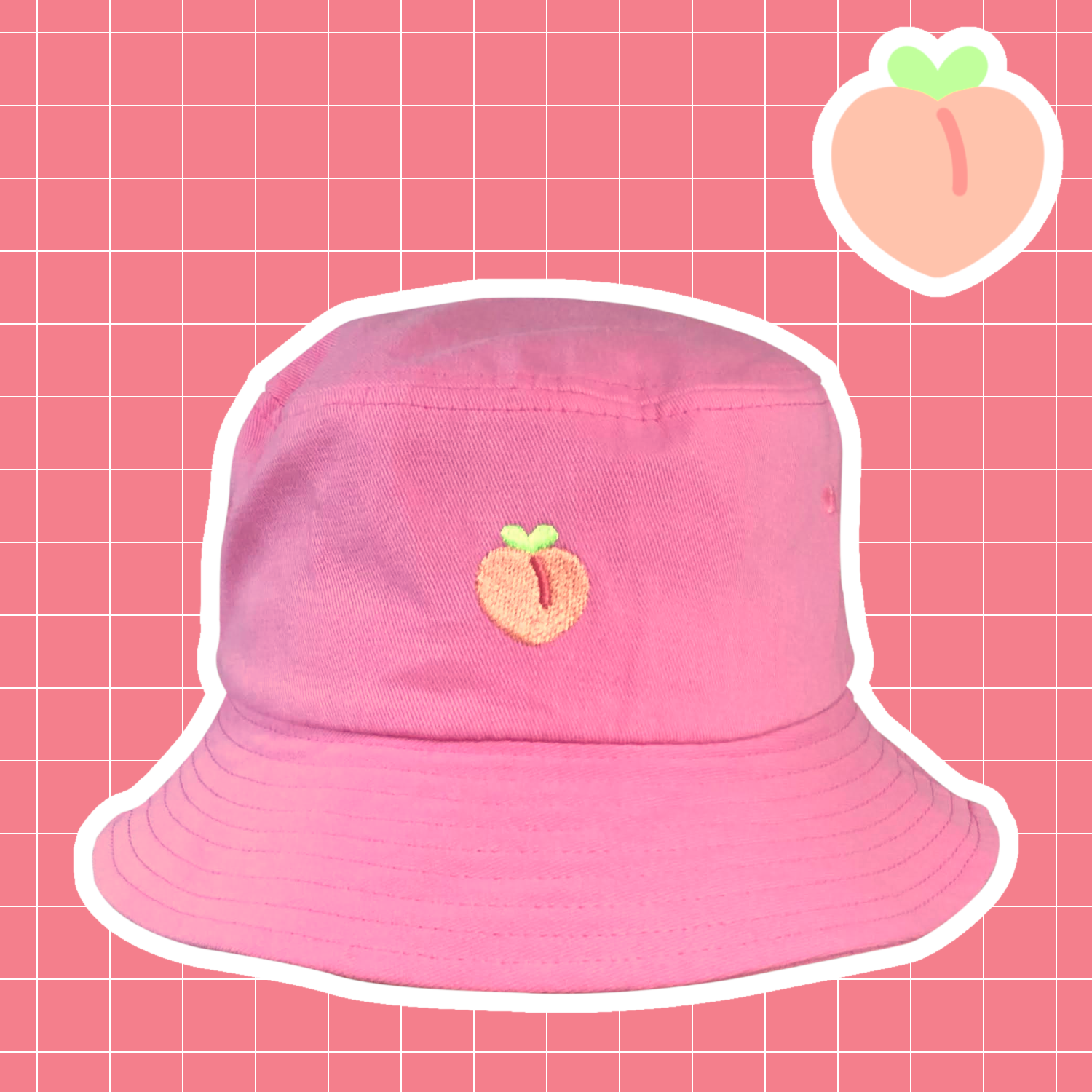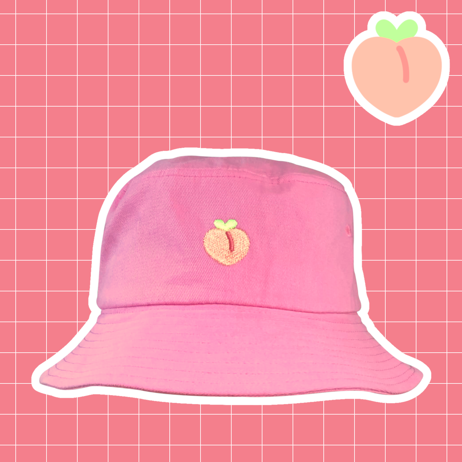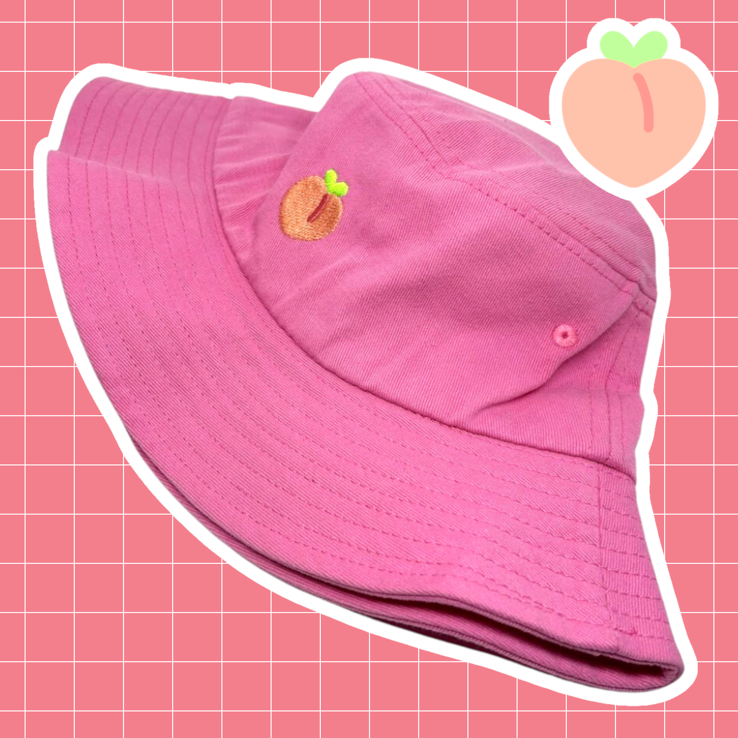 - This listing includes one pink bucket hat with an embroidered peach design.