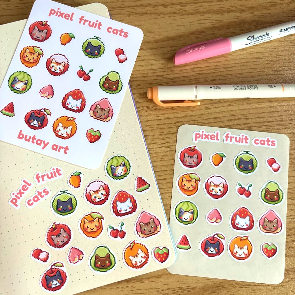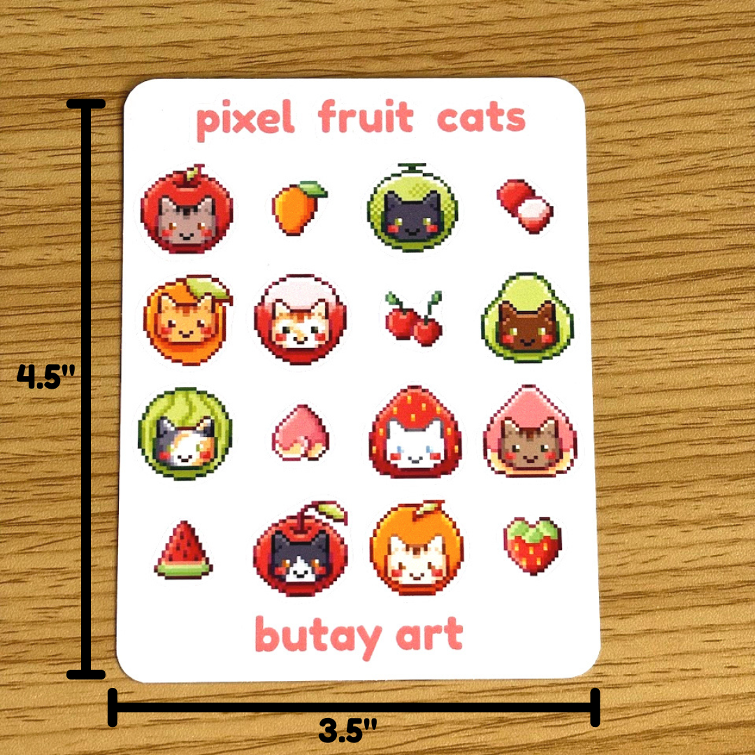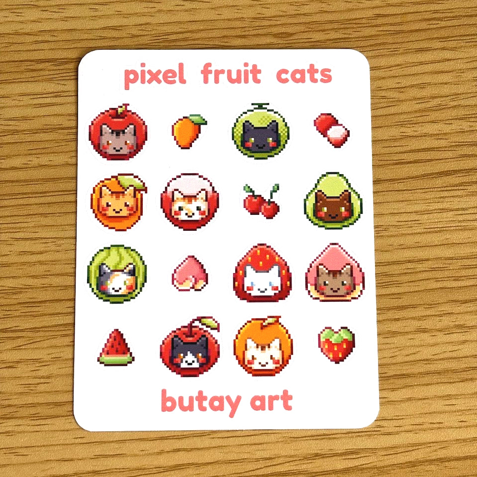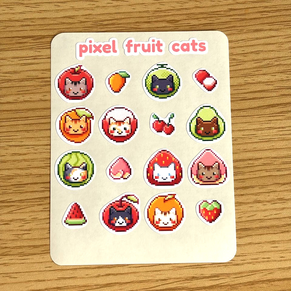 - Design features pixel art of fruits and various colored cats wearing fruit hats. :3