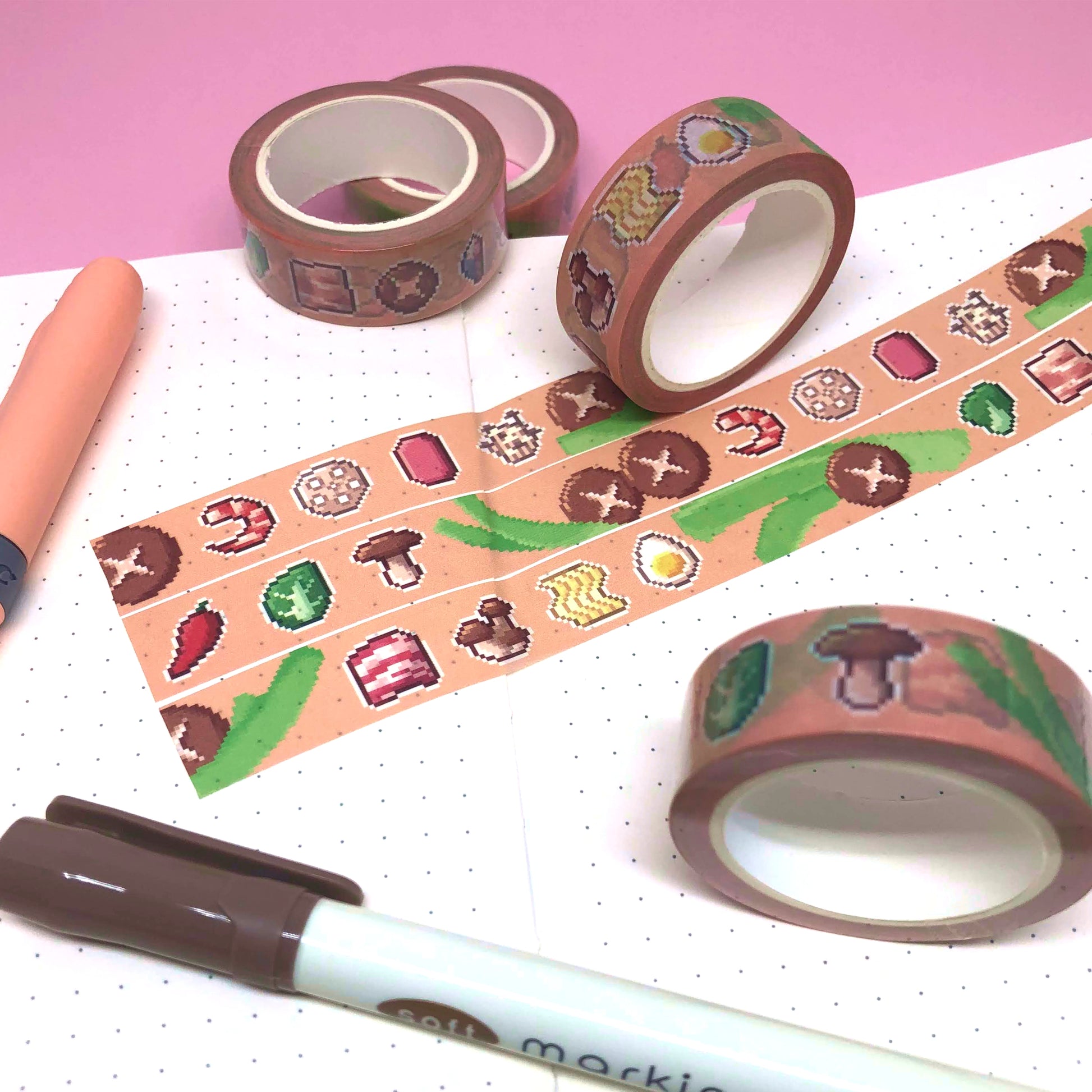- Design features pixel art of various hot pot ingredients against a tan background.