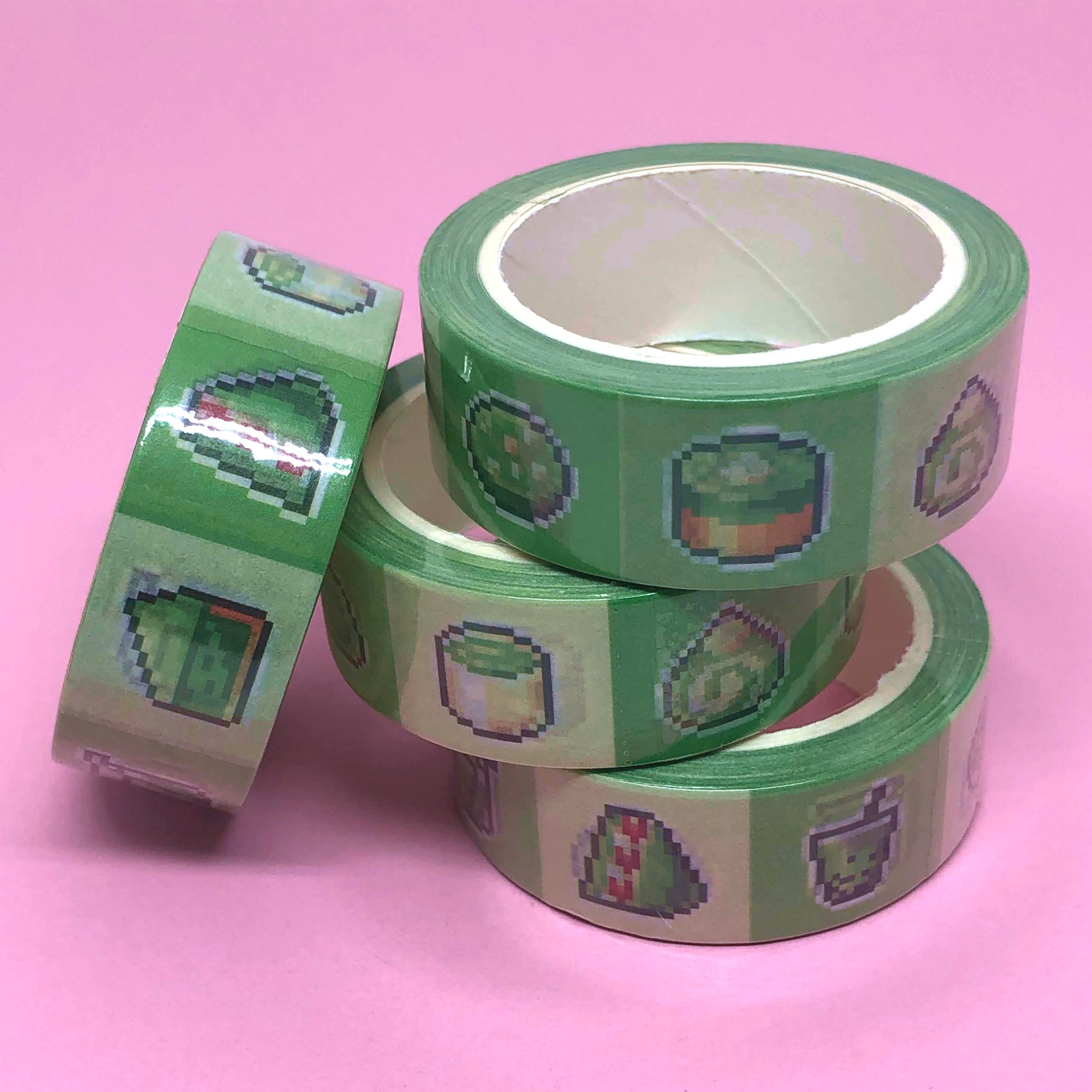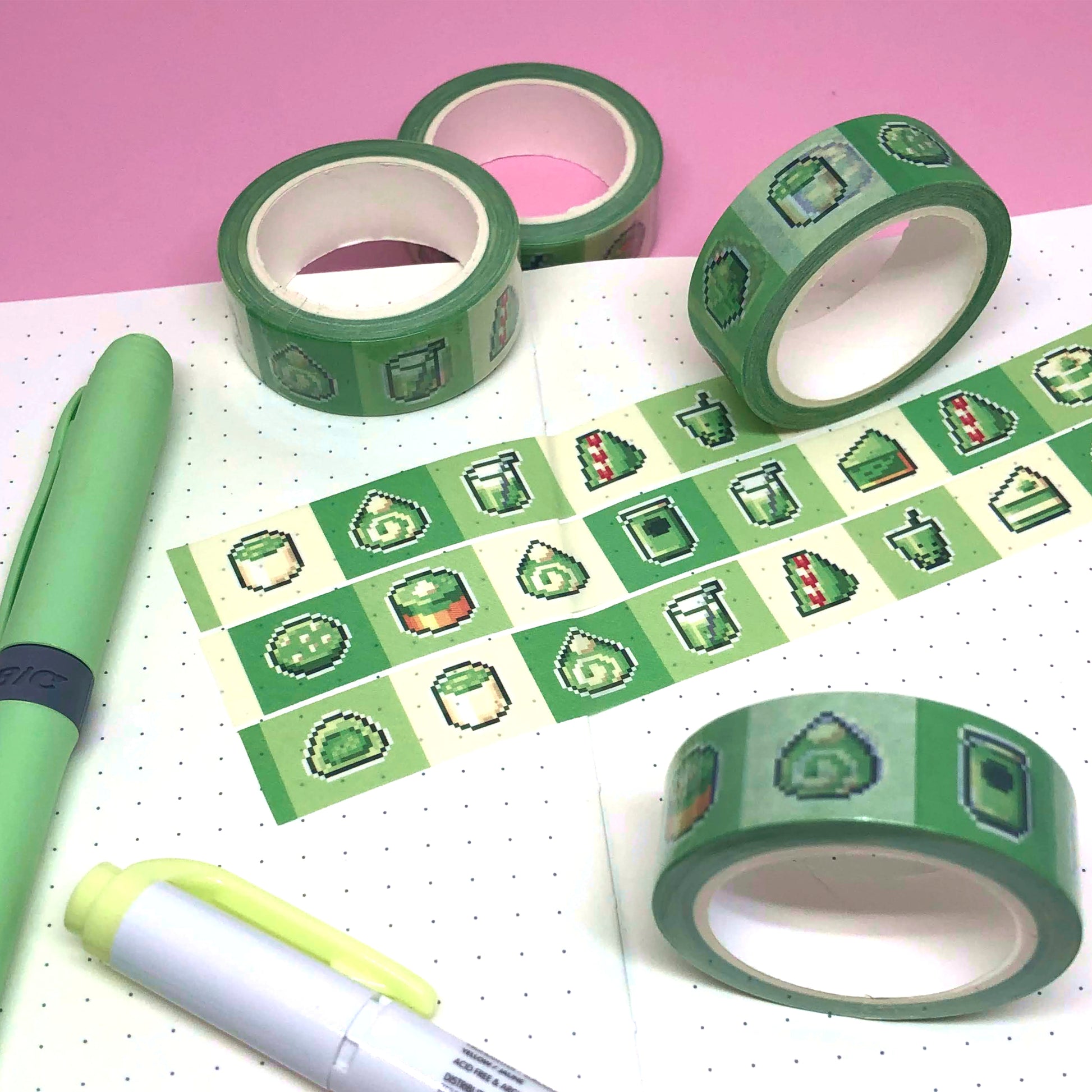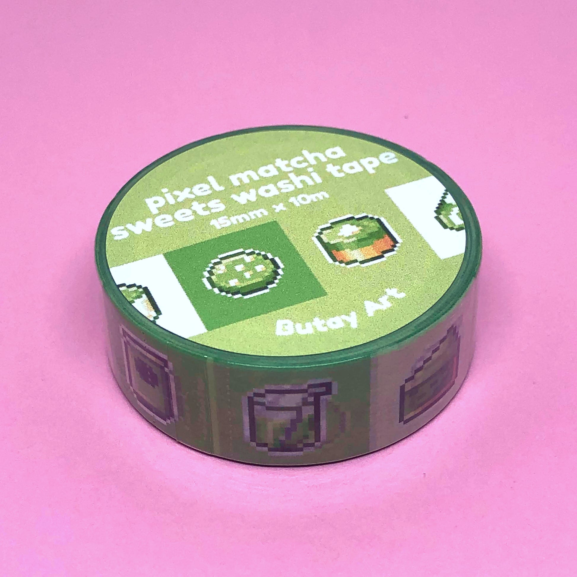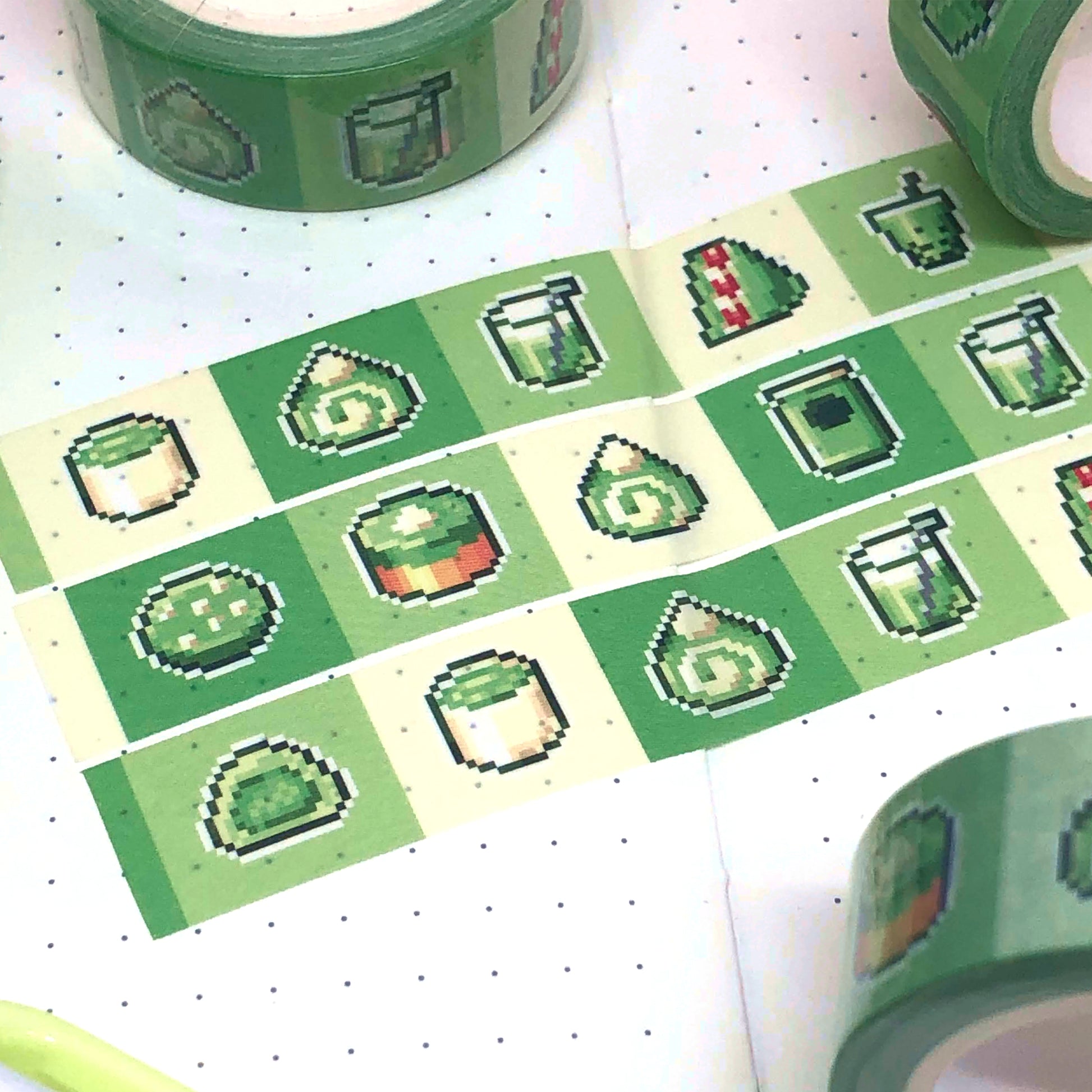 - Design features pixel art of various matcha desserts against a green and cream background.
