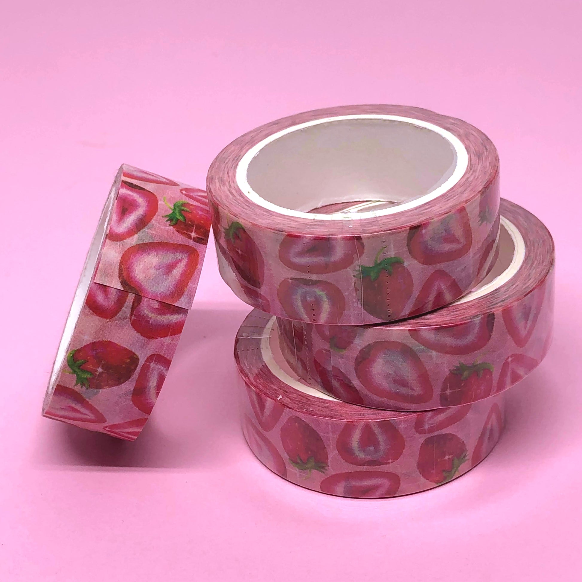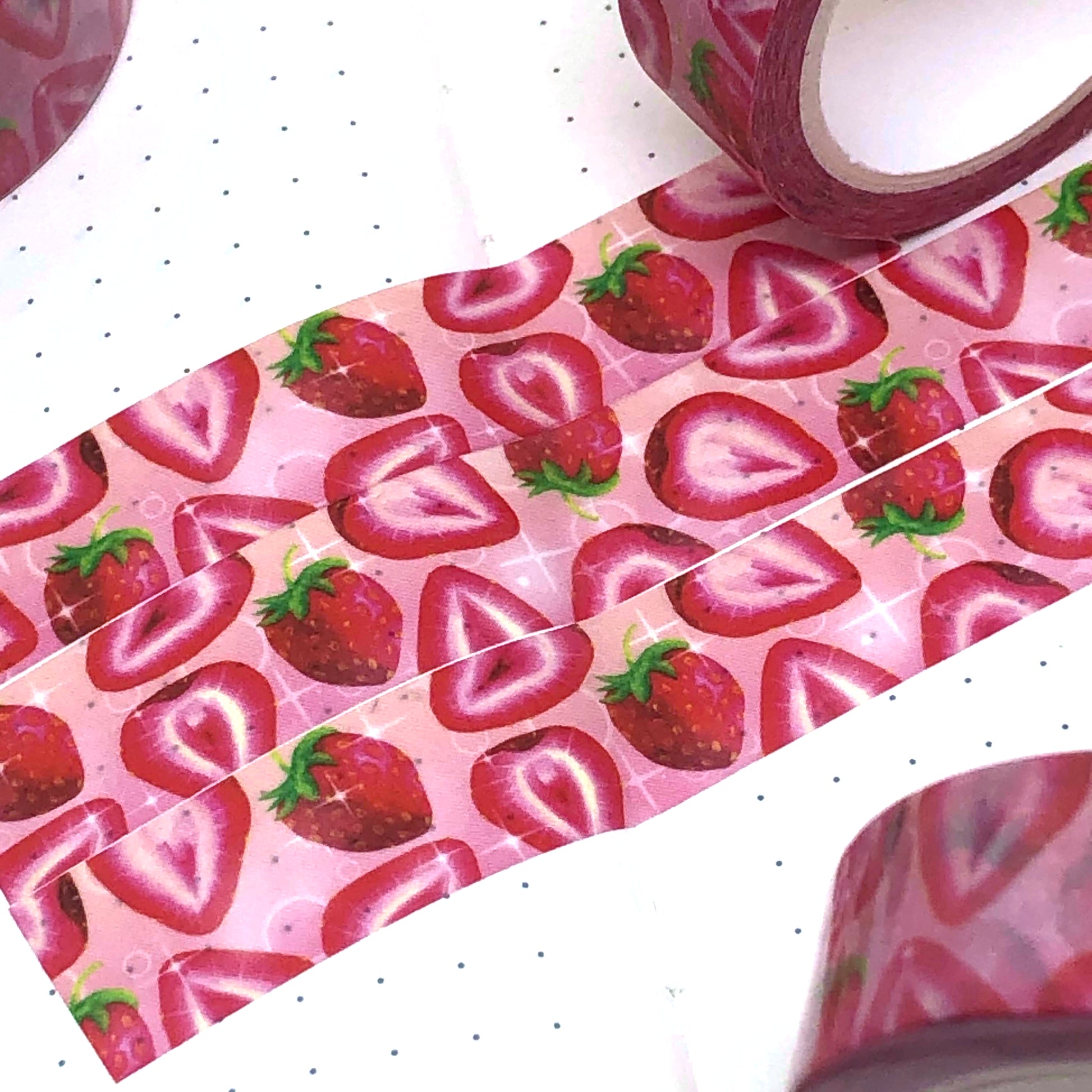 - Design features strawberries and strawberry halves against a pink to red gradient background with cute sparkles throughout the pattern.