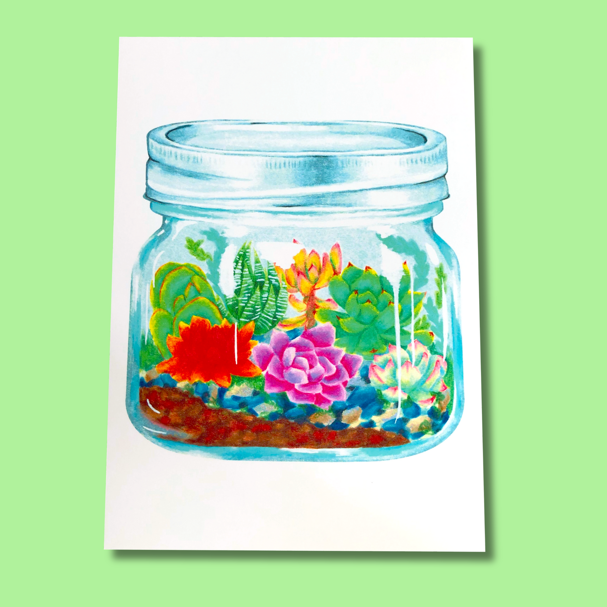 - Design features a succulent terrarium filled with various vibrant succulent plants.