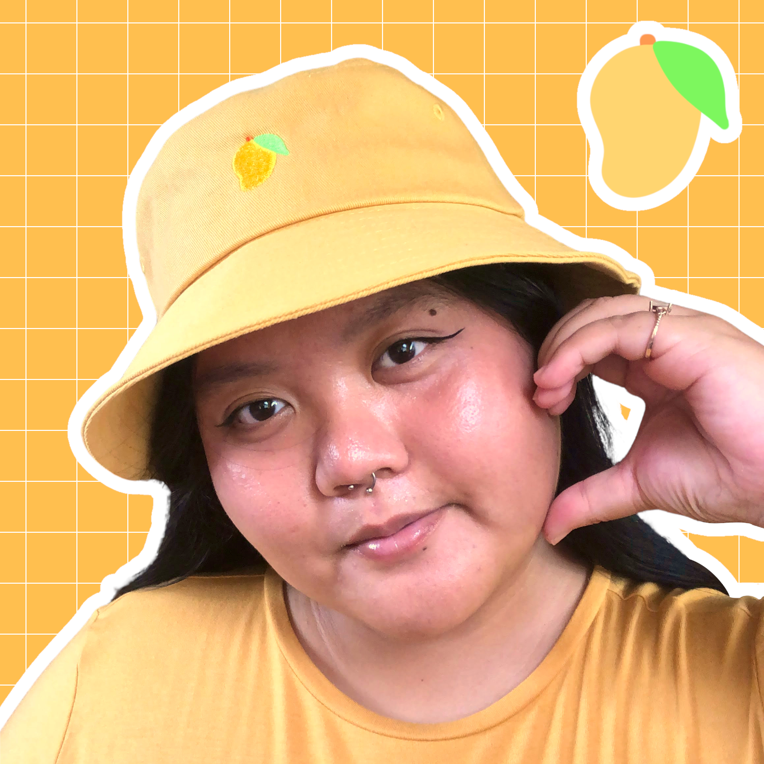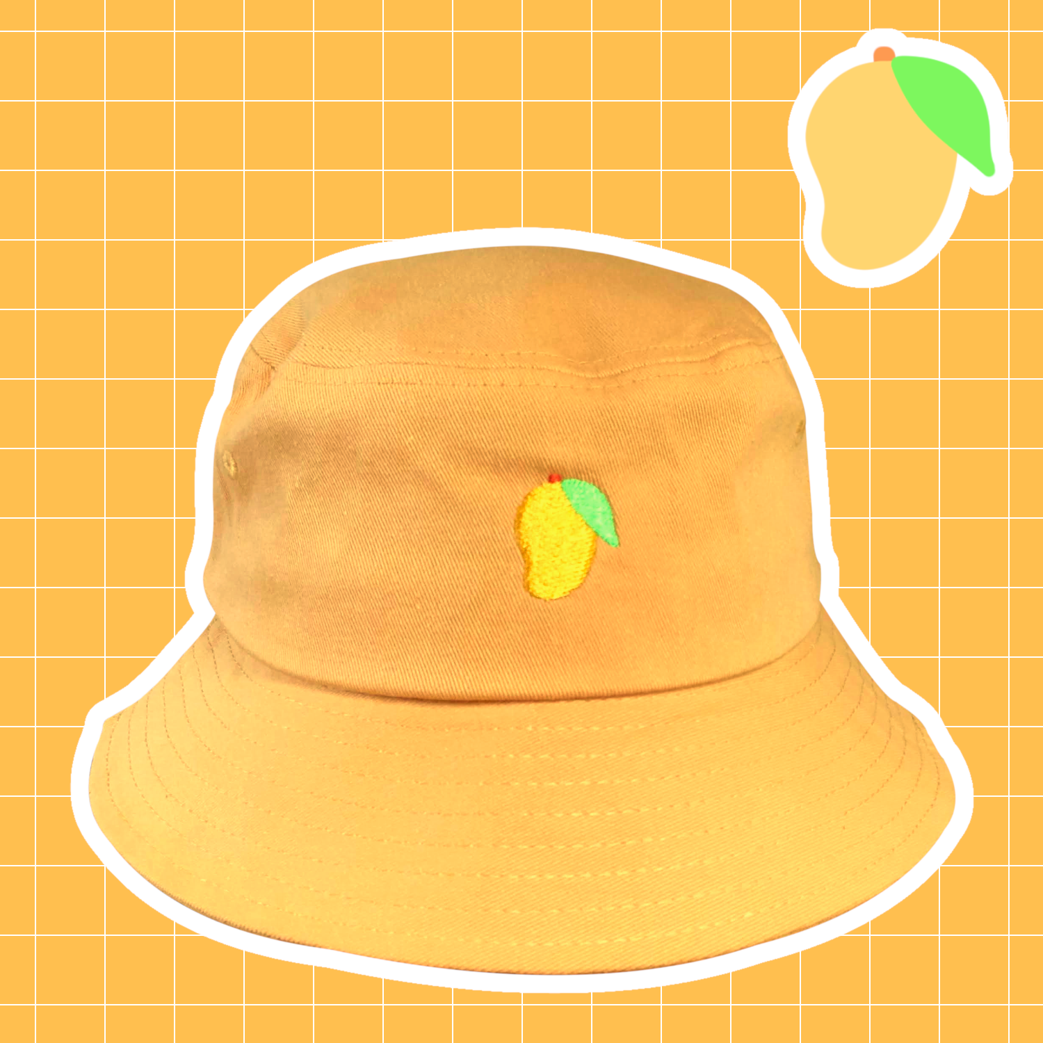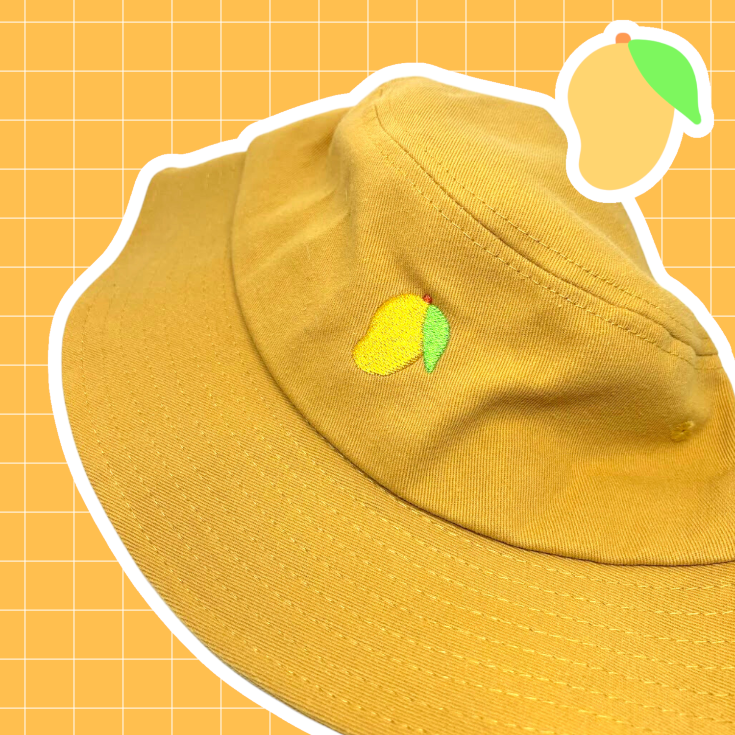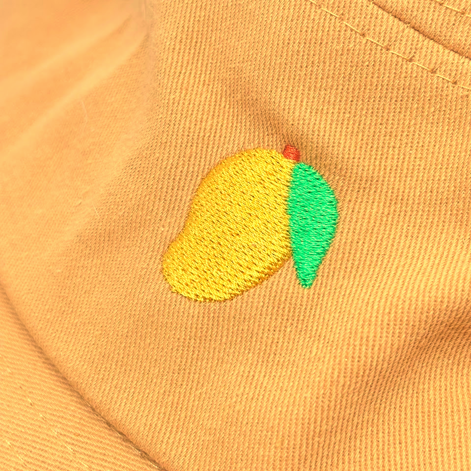- This listing includes one yellow bucket hat with an embroidered mango design.